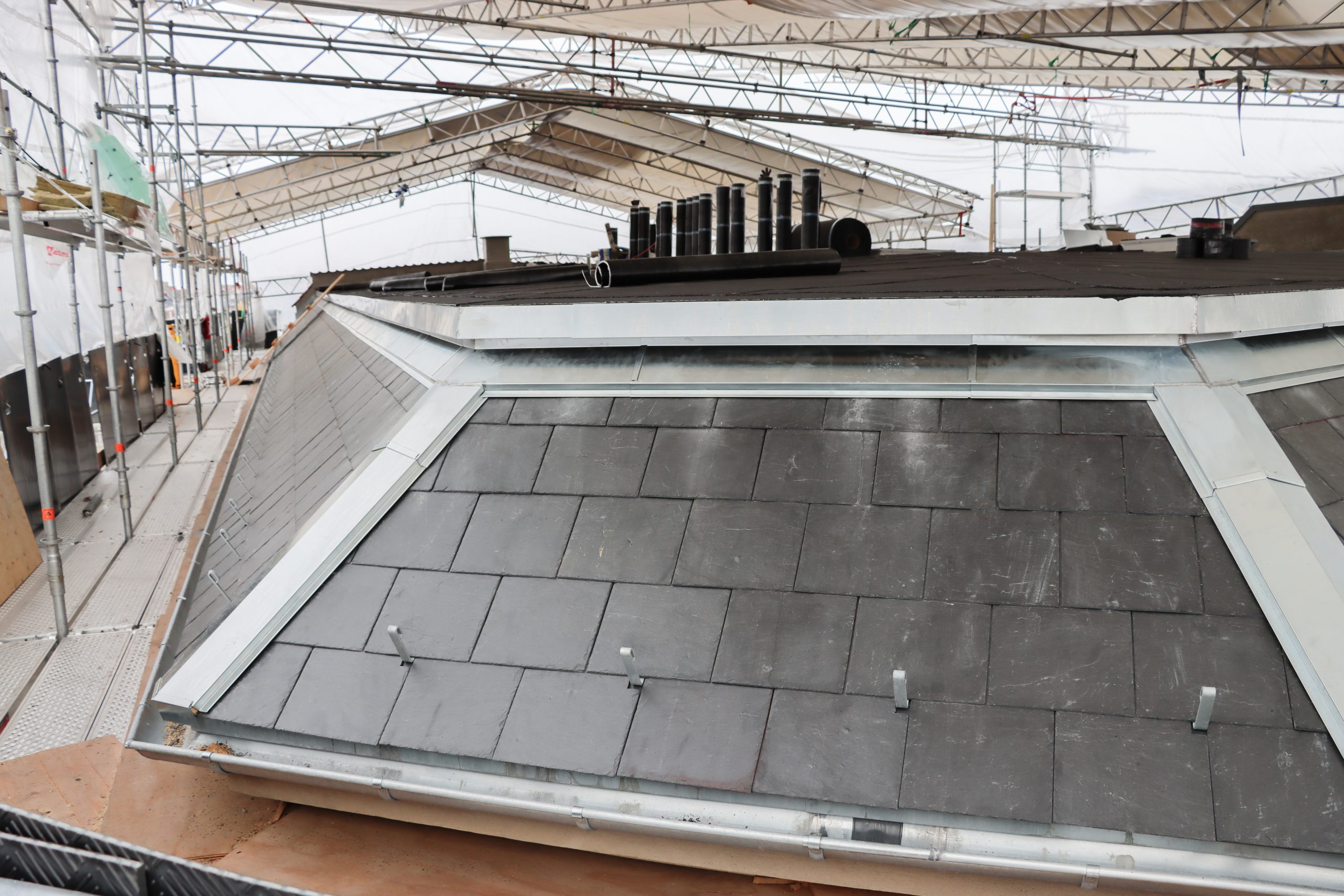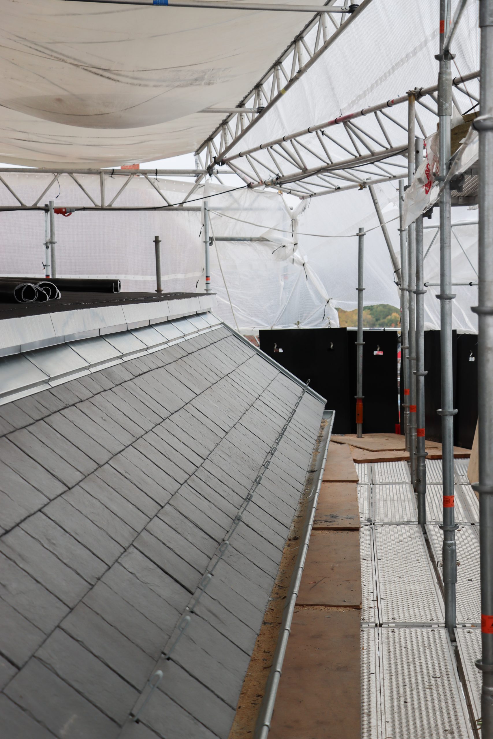 - Udskiftning af 1.300 m² tag, hvor naturskiffer dækker de skrå flader, mens tagpap beskytter de vandrette partier